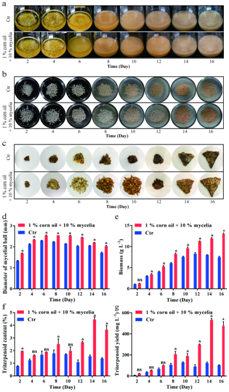 核心提示:近期,华中农业大学药用植物研究所、药用植物繁育与栽培国家地方联合工程研究中心胡学博课题组通过外源添加植物油优化了牛樟芝菌丝体发酵,通过该发酵技术将胞内三萜的含量显著提高了4倍之多,到达532.3 mg L-1。该成果,为进一步大规模工业化应用奠定了现实基础。